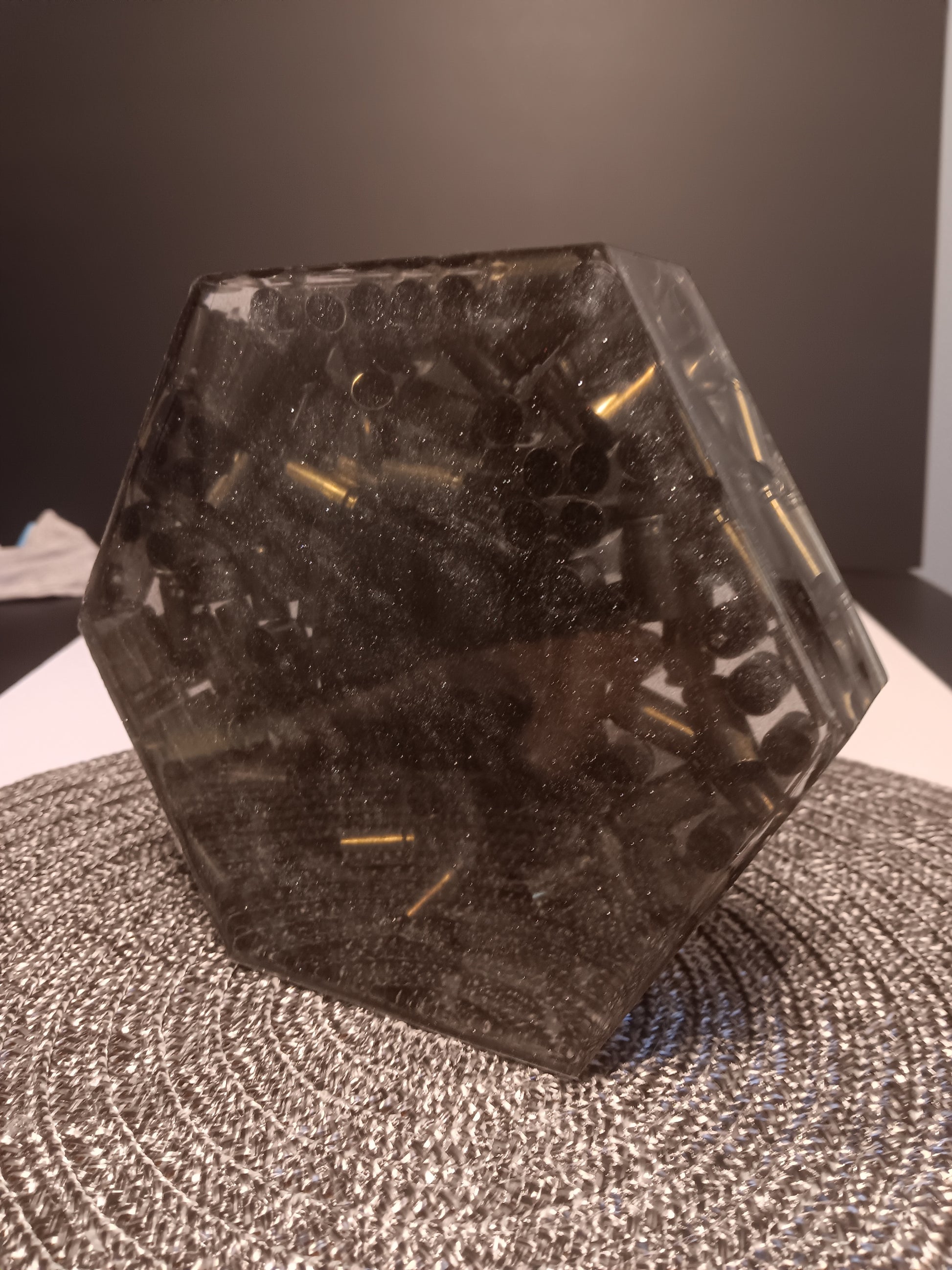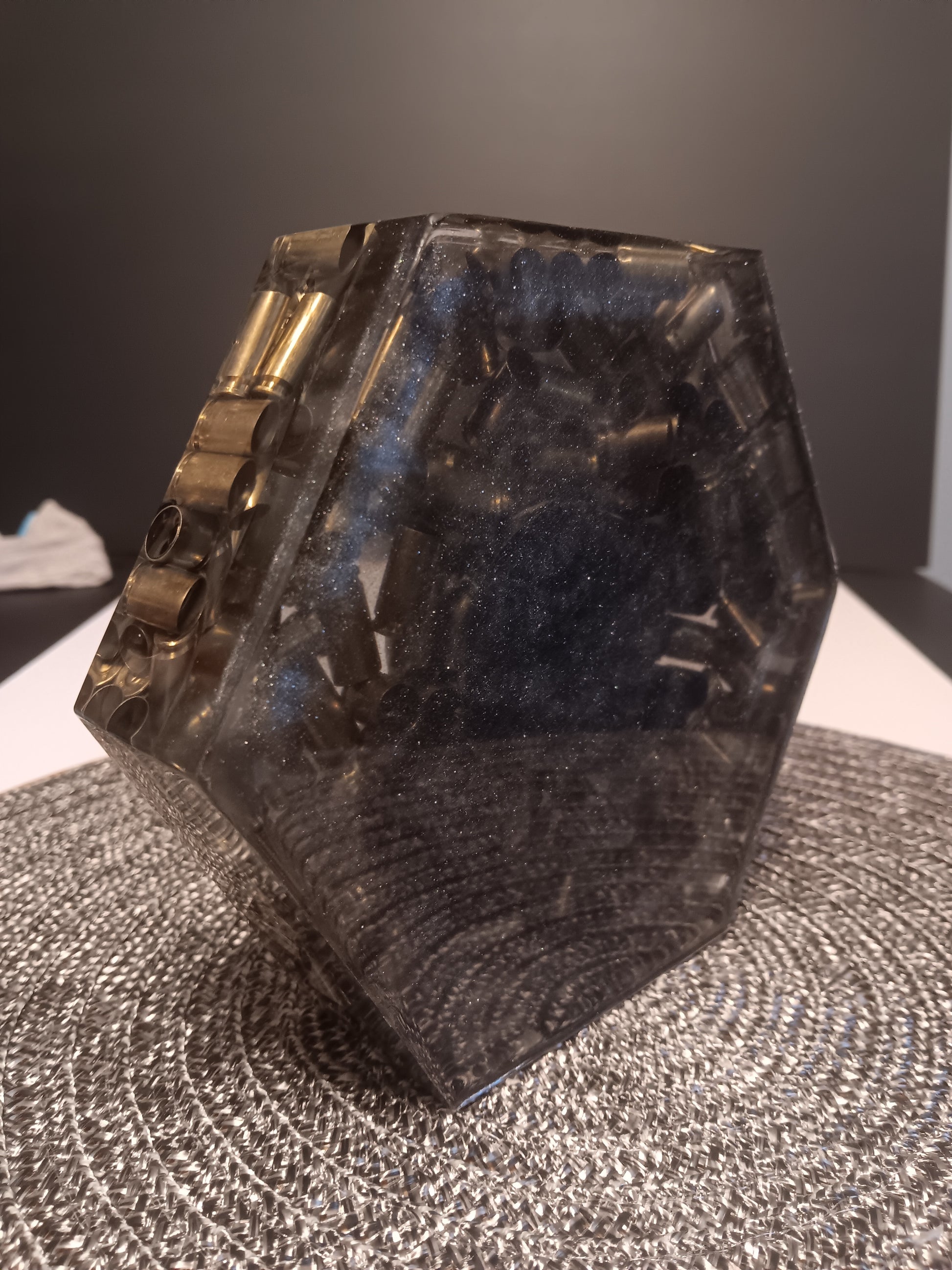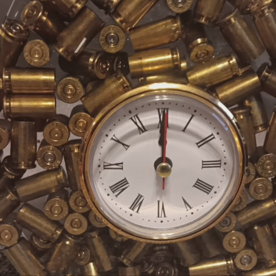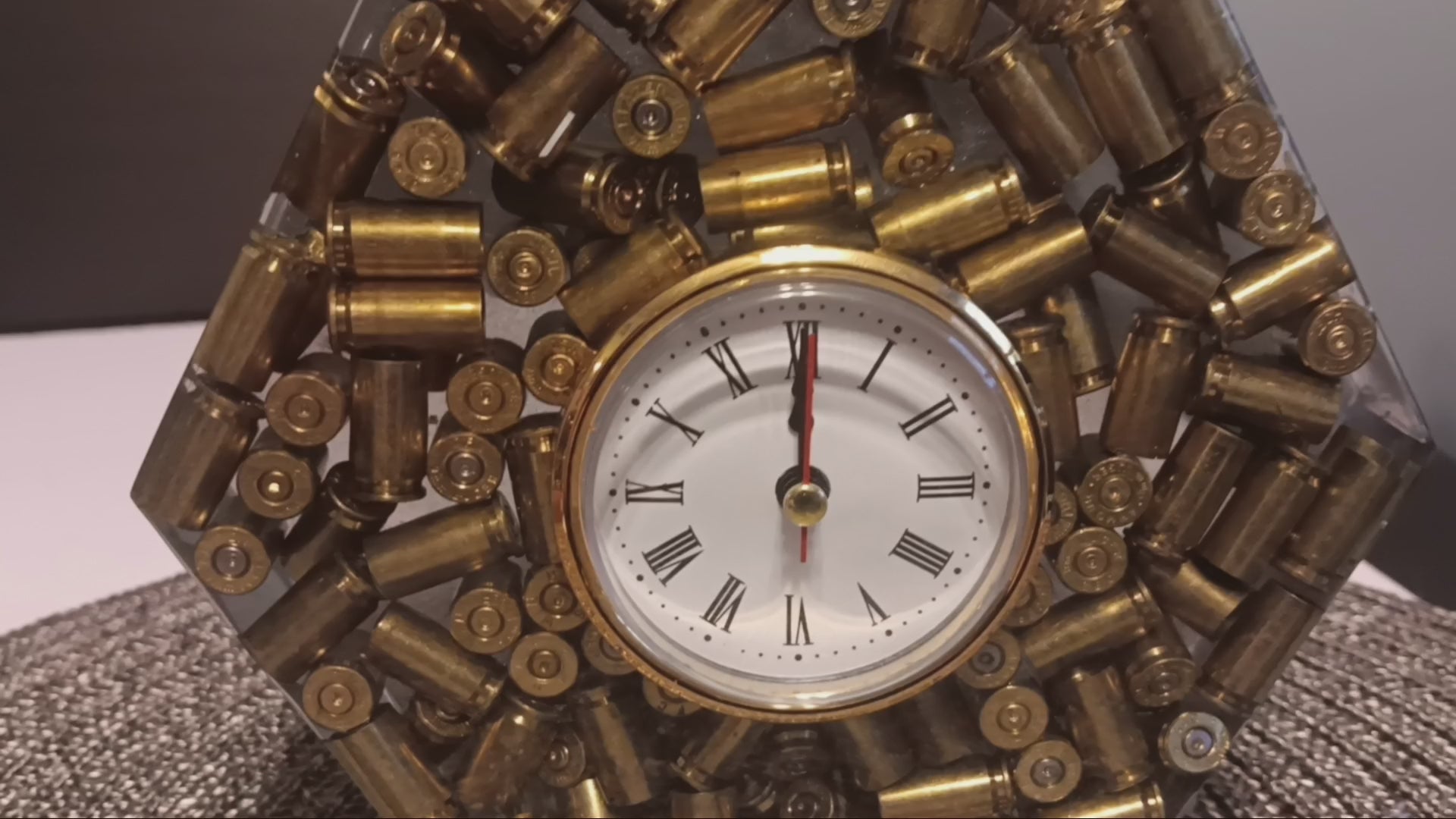 The clocks are made with high quality epoxy resin and inclusions, such as shell casings and Battleship grey mica powder. The clocks weight 2 pounds 13 oz.